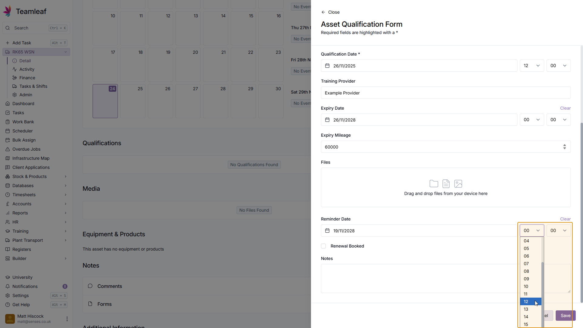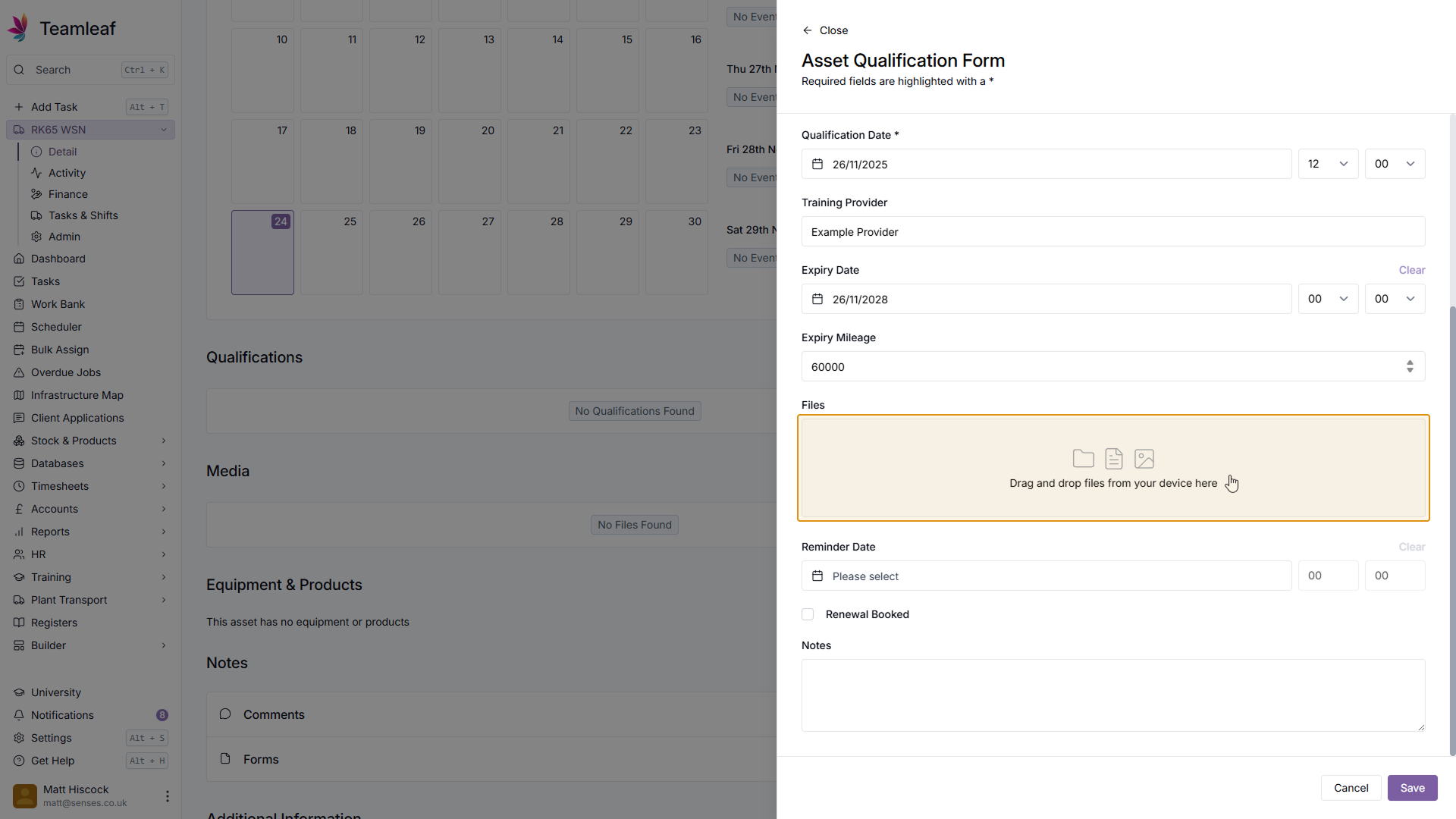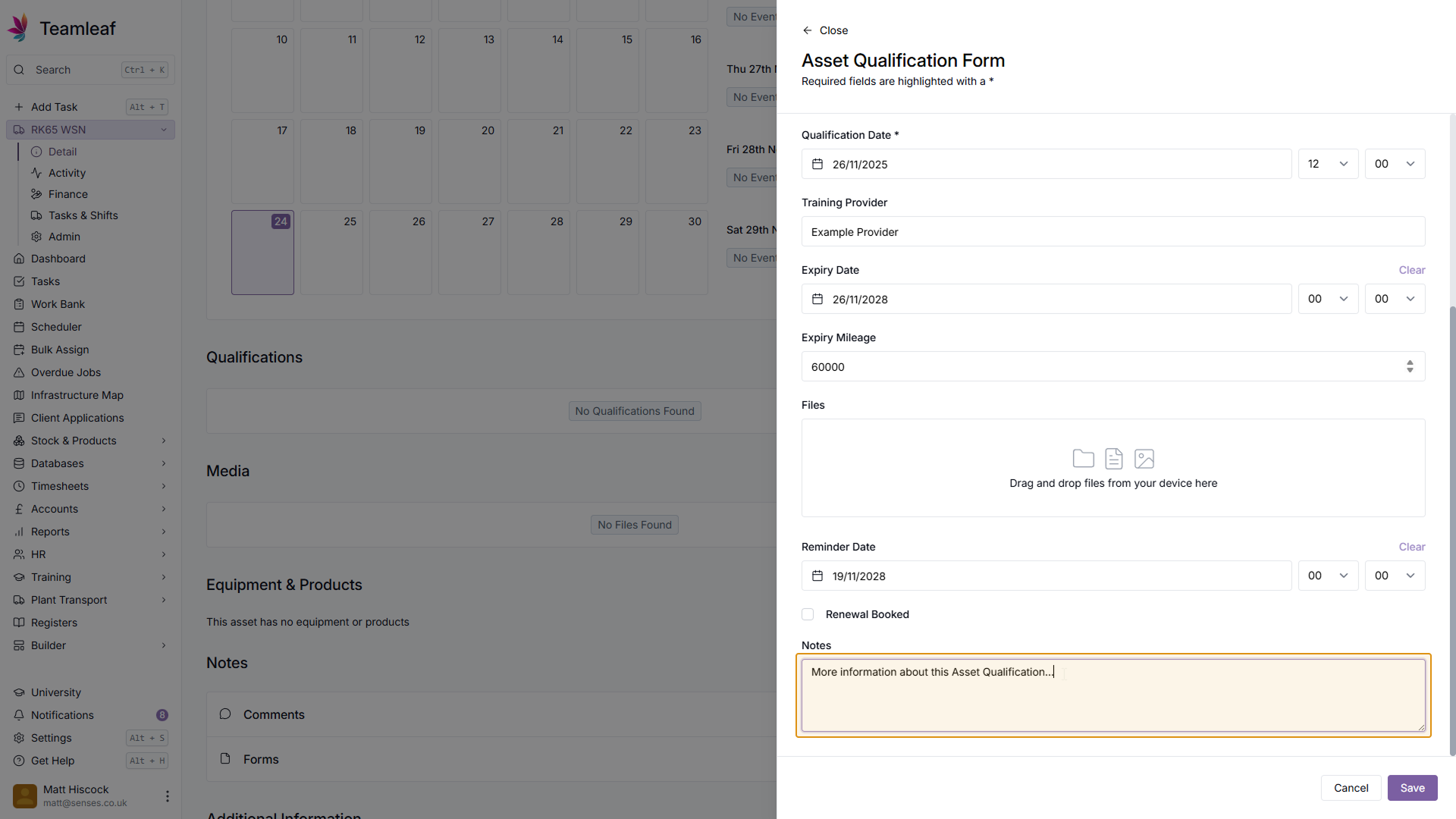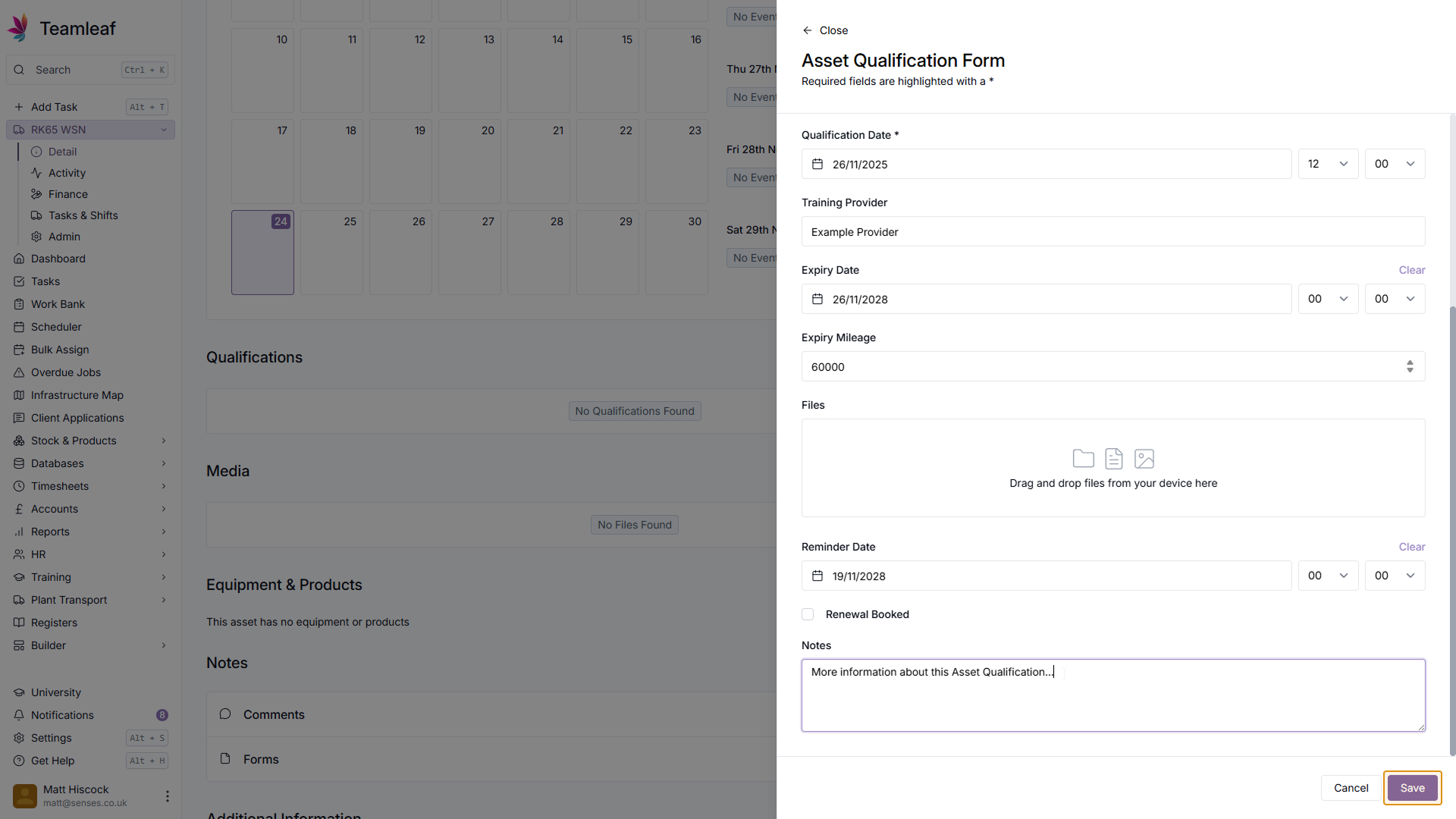 If you wish, you can set a reminder to renew this Asset Qualification by setting a Reminder Date & Time. If you already have a renewal booked, you can also add this here by ticking the 'Renewal Booked' checkbox.