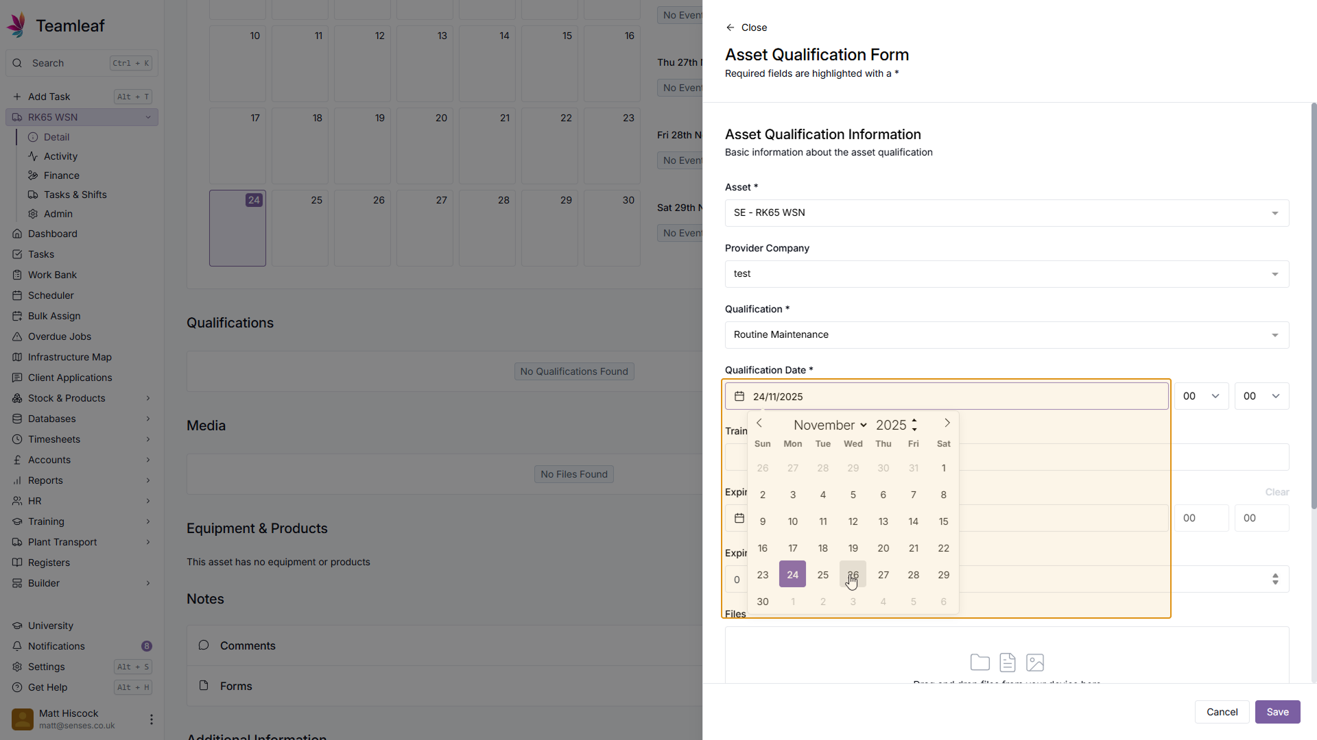 Next, select the Qualification date - by default, today's date will be selected, but you can change this if you wish by using the date picker. You can also add a time to this qualification by using the time picker to the right of the date picker.