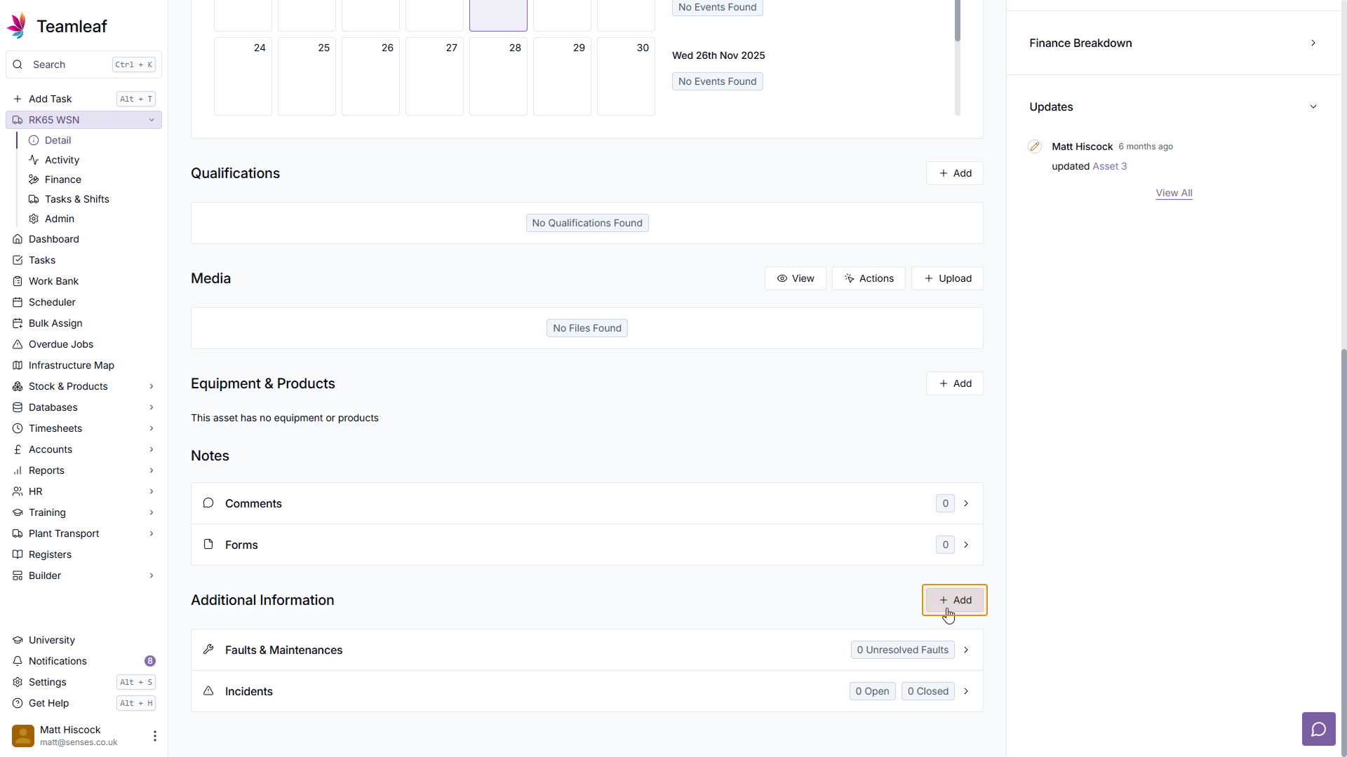 On the Asset page, scroll down to the Additional Information section, then click 'Add', then click 'Add Maintenance' in the dropdown menu